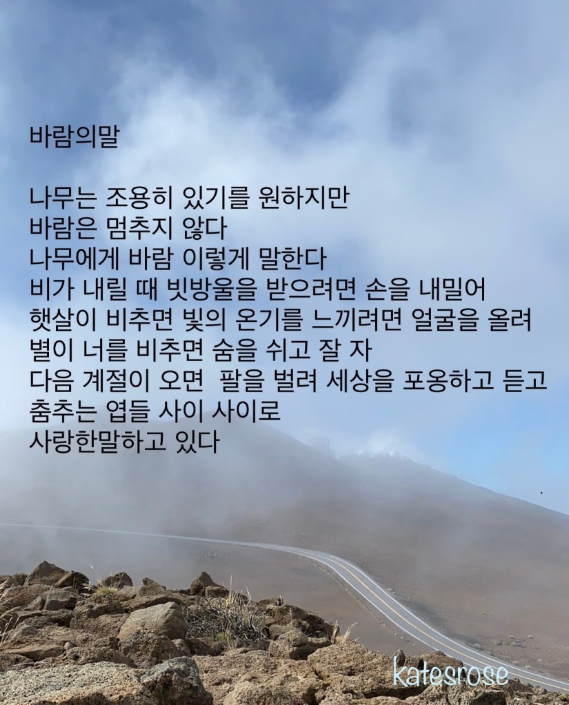 | Poem: From Wind Tree is longing be quite but wind doesn’t stop Wind says to the tree When it rains, stretch out your hands to feel the rain drops When the sun shines, hold up your face to feel the warmth of the light When the stars shower on you, take a breath and sleep peacefully When the next season comes, open your arms to embrace the world and listen Between the dancing leaves, there are my whispers of love to you 2021.6.18 |