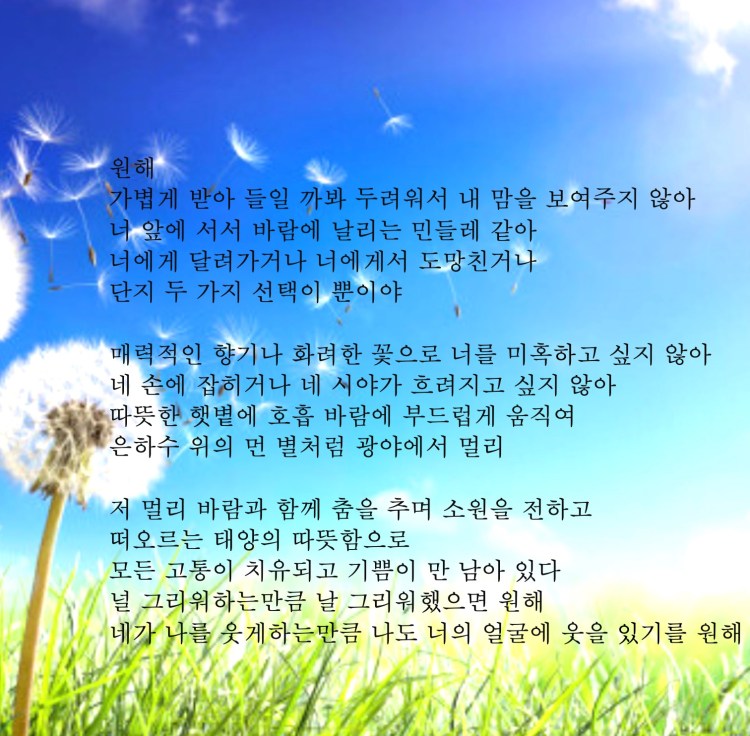| Want / Wish I don’t show my feelings for fear of you might take it lightly Standing before you, like a dandelion blowing in the wind Running to you or running away from you It seems to be the only two choices Not hypnotize you with exquisite fragrance or fancy flowers petals Not being held into your arms or blurring your eye sights As I move gently with the wind, breathe in warm sunlight Far away from the wilderness, like a distant star above the Milky Way Dance with the wind from the distance, make the wishes for you With the warmth of the rising run, may all your pain be healed and left with only joy. I wish you to miss me as much as I miss you I wish I can bring smile on your face as much as you make me smile |